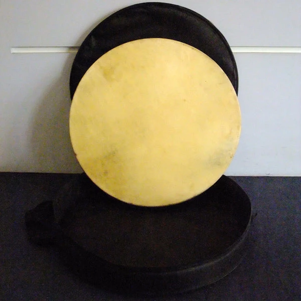 Goat skin hand drum measuring 43.3cm in diameter and 5.4cm depth.