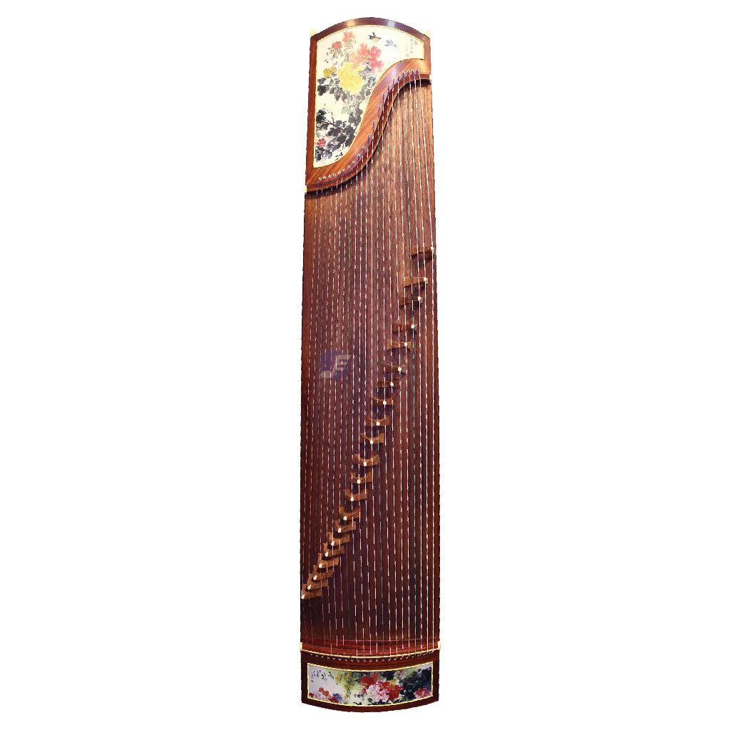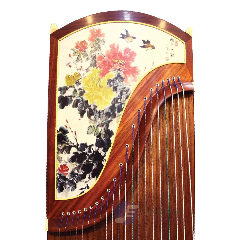 A Guzheng made of African Violet Sandalwood by Shanghai Dunhuang “Yun” in China. This is a printing of a Chinese painting depicting the blossoming of flowers in spring.