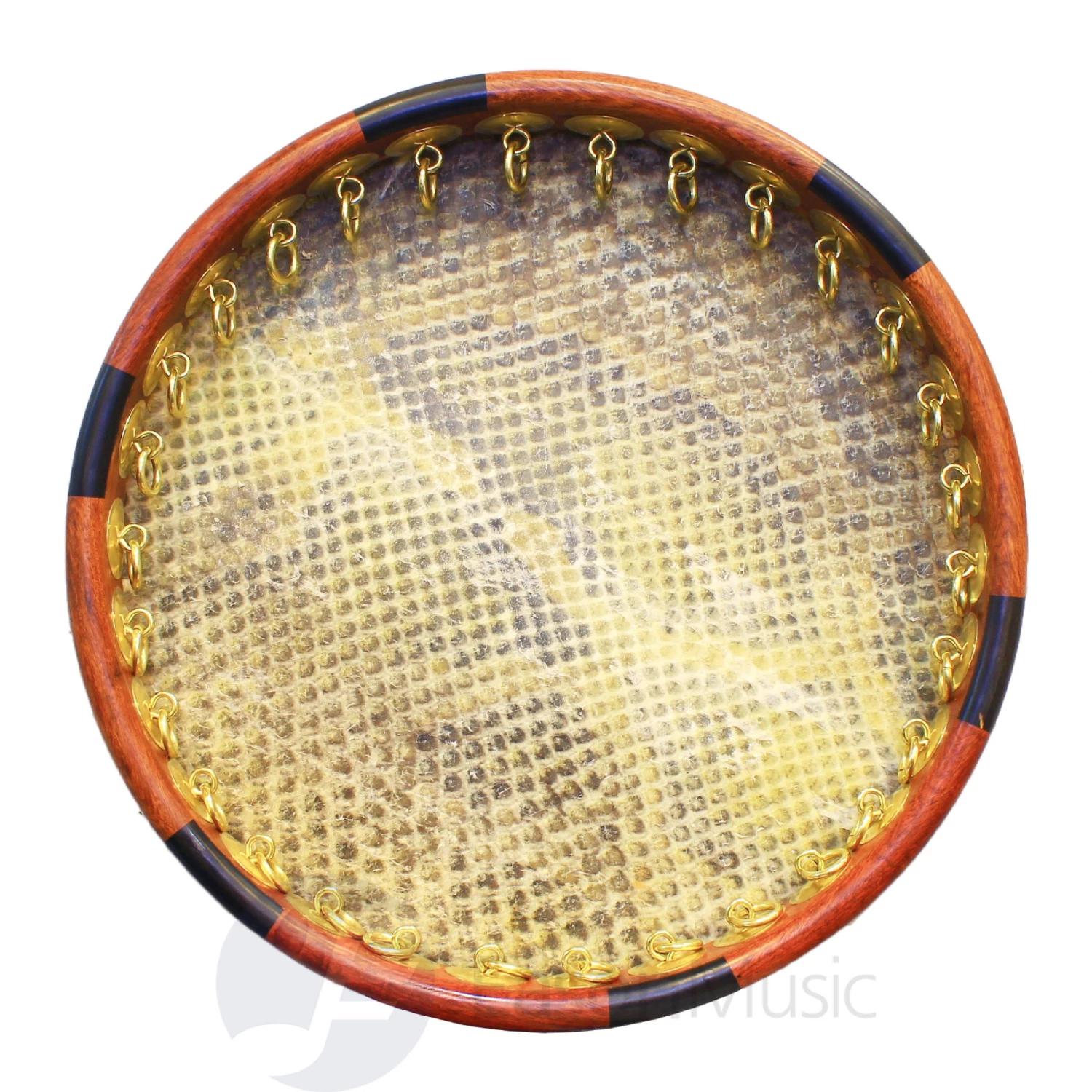Snake skin hand drum measuring 40cm in diameter and 5.4cm in depth with 30 inner rings.